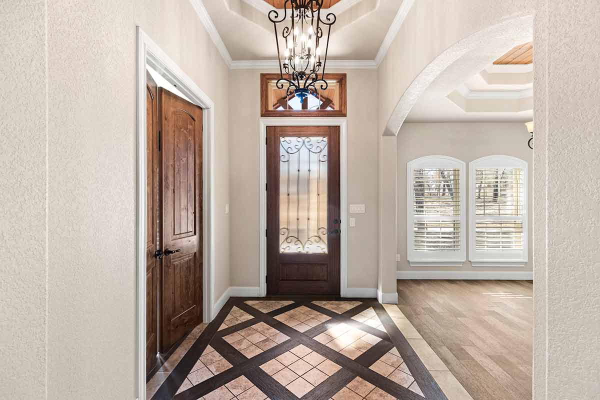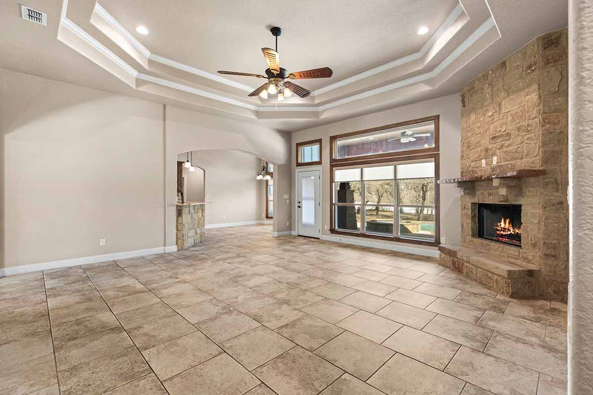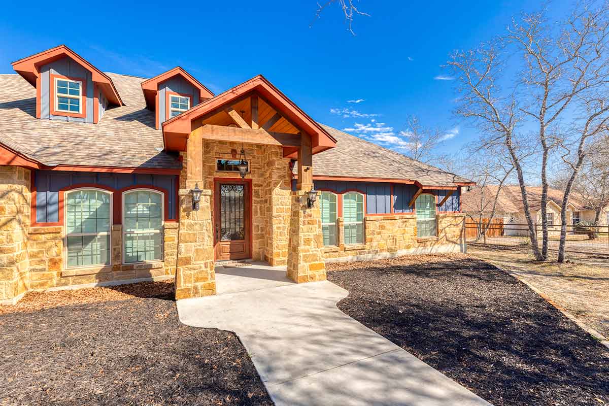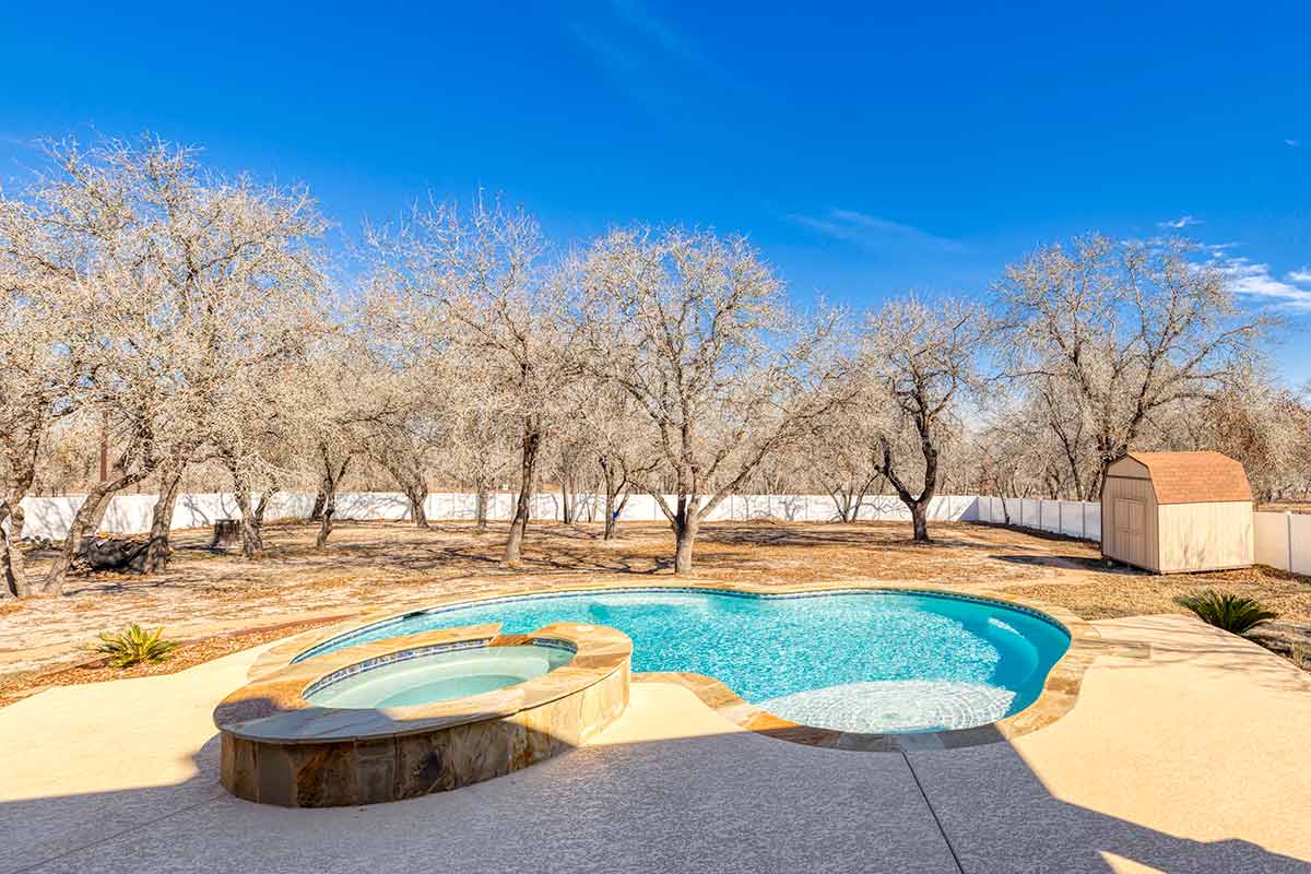 Stunning Home + Sparkling Pool & Hot Tub + 2 Acres of Wooded Countryside! Crafted in 2019 by esteemed local builder MG Legacy Custom Homes, this 1-owner home features Rustic Elegance with a touch of Mountain Lodge flair. Open floor plan with high-end finish out; Retreat to your grand living room w/rock fireplace, locally hewn mesquite mantel, overlooking gorgeous treed backyard oasis, with generous patio, gleaming pool & hot tub! Double doors open to the Dedicated Study, with beautiful wood-tile flooring in both the study & Formal Dining. Rich natural Alder cabinetry & high-level granite! Throughout the home, you’ll appreciate solid wood Knotty Alder interior doors. All ceramic tile floors (no Carpet)! Lovely plantation shutters grace many windows. Fully fenced front yard with pipe fencing, including electric gate at driveway, and a large portion of the back yard is fenced with durable vinyl privacy fencing. Convenient backyard storage shed, water softener, and gutters around the home! Country Living, minutes to city conveniences. Community park!